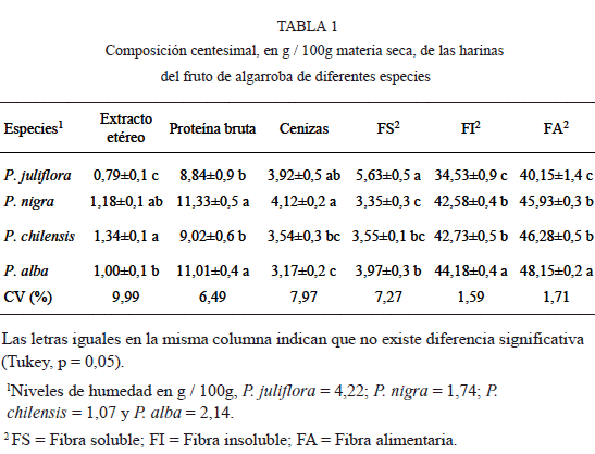 En la Tabla 1 se presentan los resultados de la composición centesimal de la harina del fruto de diferentes especies de algarroba.