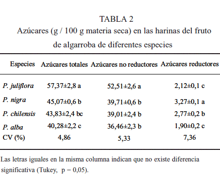 En relación con los azúcares, la P. juliflora se destacó con cantidades mucho más elevadas que las de Bolivia, confirmado por el mayor valor de azúcares no reductores (52,51 g / 100 g MS) (Tabla 2). Las HIFA de Bolivia presentaron un nivel menor de estos azúcares, pero, fueron estadísticamente iguales entre si.