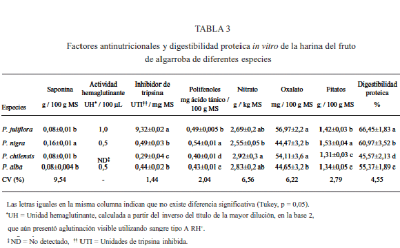 En la Tabla 3 son presentados los resultados de los factores antinutricionales y de la digestibilidad proteica in vitro de la HIFA de diferentes especies de algarroba. Los niveles encontrados de saponina y hemaglutinina son considerados bajos, aunque la P. nigra presentó el mayor nivel de saponina (0,16 g saponina / 100 g MS) y la P. juliflora la mayor actividad hemaglutinante (1,0 UH / 100 µL). El contenido de inhibidor de tripsina de la harina de las algarrobas fue estadísticamente diferente entre las especies y varió de 0,29 (P. chilensis) a 9,32 (P. juliflora) UTI / mg MS.