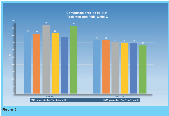 Comportamiento de la PAM en los Pacientes con ascitis y PBE Child C: en todos los pacientes se observó disminución de la PAM posterior a la administración de propranolol, pasando en promedio de 86 mmHg a 71 mmHg (Figura 5).