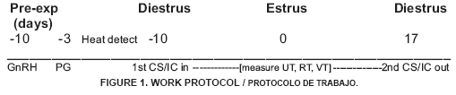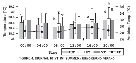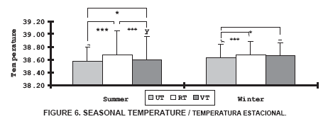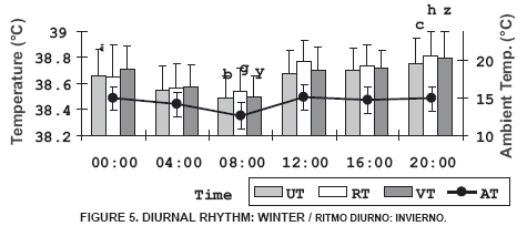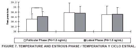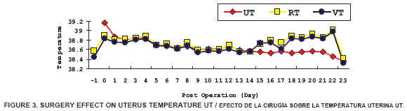 No se ha reportado adecuadamente el ambiente fisiológico del útero bovino debido a las limitaciones en la metodología. El objetivo del estudio fue medir la temperatura uterina bovina (UT) con un nuevo termómetro intracorporal (IC). Los datos fueron comparados con la temperatura rectal (RT) y vaginal (VT) convencional. El IC es un dispositivo alojado dentro de un botón de acero limpio, con 15 mm de longitud, 5 mm de ancho, y con un rango de +15 a +46°C en 0,125 incrementos de °C. Se calibró con un termómetro del mercurio normal, y también se puso en correlación con un termómetro rectal instalado con una sonda sensora de temperatura (0,1°C de precisión). UT era medida a intervalos de 20 min durante 4 semanas, mientras RT y VT eran medidas cada 4 h. Once vacas Negras Japonesas, 8 en el verano y 3 en invierno, se sometieron a secciones de cesárea (CS). Por laparotomía trans-lumbar el IC se instaló en el cuerno uterino izquierdo próximo a la unión del uterotubarica, durante una CS. Después de grabar durante 4 semanas, el CI fue removido con una 2da CS y el dispositivo se montó en el lector del mismo, en la PC. Los datos acumulados se analizaron por ANOVA para mediciones repetidas. La temperatura ambiental (AT) se grabó simultáneamente. En 5 vacas, se colectó sangre, diariamente, para determinaciones hormonales (estradiol) y se realizó ultrasonografía para supervisar la dinámica ovárica. La temperatura después de la cirugía fue temporalmente elevada durante 4 días (0,14°C) y se excluyó. Los promedios en UT, RT y VT en verano (AT: 28,76°C) fueron 38,57 ± 0.23°C, 38,67 ± 0,23°C, 38,60 ± 0,35°C, y en invierno (AT: 14,46°C) fueron 38,63 ± 0,21°C, 38,68 ± 0,21°C, 38,67 ± 0,20°C, respectivamente. UT fue significativamente baja que RT o VT, y UT en el verano fue más baja que en invierno (P < 0,01). Se observó el ritmo diurno en todas las tres temperaturas, más bajo a las 08:00 y más alto a las 20:00 hs. En la ovulación, UT en la fase luteal fue significativamente superior (38,61 ± 0,20°C) que en la fase del folicular (38,51 ± 0,22°C, P < 0,01), sin embargo no se observó ninguna diferencia en RT o VT. En conclusión, el IC colocado en la unión uterotubal midió efectivamente la UT y detectó su ritmo diurno. La fluctuación de la UT fue estable, pero mostró hipertermia en la fase lúteal. El IC, aparentemente es un dispositivo adecuado para medir la temperatura uterina durante el ciclo estral y probablemente, en otros procesos reproductivos fisiológicos en las vacas.