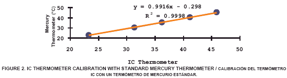 IC thermometer can serve as a standard one data base and carry relevant information while affixed to an object. Armored in IC, the thermometer can measure temperatures in demanding environments and can be reusable for number of cycles. The novel IC is 15 mm in length and 5 mm in width, and can be installed inside the uterine lumen. The relation of thermal biology and reproductive physiology is still unclear, and therefore further research in these areas is necessary to identify the problem [6]. A study was designed to measure bovine uterine temperature (UT) by novel IC thermometer (IC). Data was compared with conventional rectal (RT) and vaginal temperature (VT).