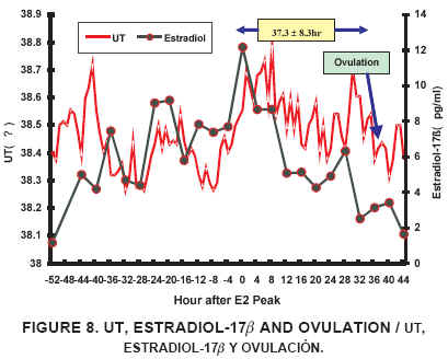 Diurnal rhythm was observed at all three temperatures; UT, RT and VT, lowest at 08:00 and highest at 20:00 in both summer and winter period (FIGS. 4 and 5). Averages in UT were significantly lower than RT and VT in both seasons and UT fluctuation was rather stable (FIG. 6). Upon ovulation, UT in the luteal phase was significantly higher (38.61 ± 0.20°C) than in the follicular phase (38.51 ± 0.22°C, P < 0.01), whereas neither difference was observed in RT or VT (FIG. 7). Peak of Estradiol-17b levels preceded UT peak by 8 h and also correlated with ovulation by 37 h (FIG. 8).