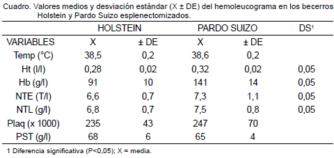 En la presente evaluación, no se evidenció ninguna reacción adversa que pudiera ser atribuida a la cirugía en los becerros esplenectomizados. Los valores de los componentes del hemoleucograma obtenidos en este trabajo preliminar, están representados en el Cuadro. Los valores medios de la temperatura rectal postesplenectomía en ambos grupos, no indicaron diferencia estadística, a pesar de ser los animales diferentes en biotipo y edades. Las anteriores medias oscilaron dentro de los valores fisiológicos señalados para la especie (Blood y Radostits, 1992).