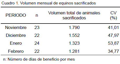 La determinación del volumen de sacrificio de animales de la especie equina sacrificados en la planta de beneficio se llevó a cabo durante el periodo de estudio. Para lo cual, se reportó un total de 5.946 animales sacrificados con un promedio de 1.487 equinos por mes, obtenidos de un total de 91 días de beneficio (Cuadro 1).