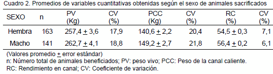 El Cuadro 2 muestra los promedios de PV, PCC y RC según el sexo de los animales sacrifi cados, encontrándose de forma descriptiva promedios superiores para los machos, debido a su mayor grado de conformación.
