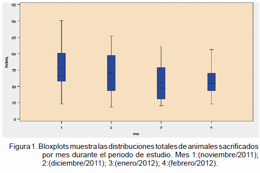 Las distribuciones totales de animales sacrificados por mes muestran que para los meses de noviembre y diciembre se reportó un promedio de 77,82 + 6,65 y 70,54 + 7,21 animales/ día de beneficio, respectivamente, obteniendo los mayores volúmenes; mientras que para los meses de enero y febrero se reportaron valores de 55,12 + 6,06 y 58,22 + 4,31 animales/día de beneficio, respectivamente (Figura 1).