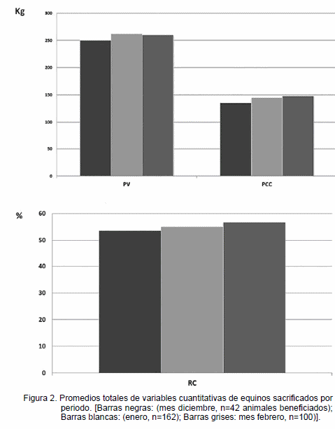 En países como Brasil y Argentina han reportado valores de peso vivo de animales para sacrificio entre 300 y 600 kg, mientras que en países Europeos, esta cifra es superada debido principalmente a que el biotipo racial utilizado es de mayor tamaño (OAJ, 2010). Dichos valores difieren con el valor de 259,9 kg reportado en el estudio, debido a que el biotipo racial predominante es el caballo mestizo.