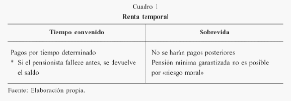 El producto final de las reformas es la pensión, igual o por encima de la mínima. Una modalidad es contratarla por término; consiste en la devolución del saldo insoluto del precio de compra, si el pensionado muere antes de aquél. Si sobrevive al término, la prima pagada queda devengada por la administradora y no se harán pagos posteriores (Magee, 1947). figura2