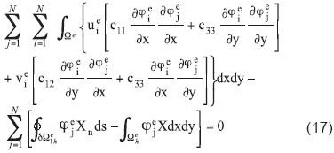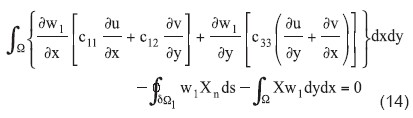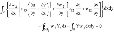 Al multiplicar las Ecs. (9a) y (9b) por funciones de prueba w1 y w2, integrando y aplicando el teorema de Green, y después de varias operaciones de integración se obtienen las ecuaciones: