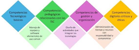 Para implementar las Tecnologías de la Información y la Comunicación (TIC) de manera efectiva en el aula, un docente debe desarrollar una serie de competencias mínimas que abarcan conocimientos técnicos, pedagógicos y actitudinales. Estas competencias pueden agruparse en las categorías descritas en la figura 1.