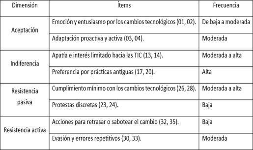 La tabla 2 sintetiza las dimensiones clave relacionadas con la resistencia docente al uso de tecnologías en actividades académicas. Agrupa actitudes como la aceptación, indiferencia, resistencia pasiva y resistencia activa, destacando los ítems que representan cada categoría. La finalidad fue identificar patrones en la disposición de los docentes hacia el cambio tecnológico, desde un entusiasmo moderado hasta conductas activas de sabotaje o evasión. Esto proporciona una visión integral para diseñar estrategias efectivas que aborden las resistencias, promoviendo capacitaciones personalizadas y el fortalecimiento de habilidades adaptativas en el uso de TIC en entornos educativos.
