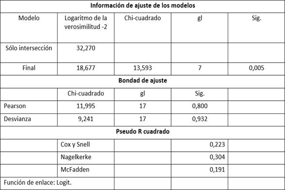La tabla 4 presenta los resultados del modelo logit, proporcionando información clave sobre su ajuste, capacidad explicativa y calidad general. El modelo final mostró un mejor ajuste en comparación con el inicial, lo que evidencia que incorpora información relevante para explicar la variabilidad en los datos. Los indicadores de bondad de ajuste reflejaron que no hubo diferencias significativas entre los valores observados y los predichos, confirmando un buen desempeño del modelo. Además, los valores de pseudo R cuadrado mostraron una capacidad explicativa moderada, lo cual es consistente con estudios en áreas sociales y educativas, donde los modelos suelen explicar una proporción limitada de la variabilidad. En particular, el coeficiente de Nagelkerke sugirió que el modelo logra capturar de manera significativa una parte importante de la relación entre las variables analizadas. Estos resultados respaldan la utilidad del modelo para interpretar y predecir los datos dentro de este contexto.