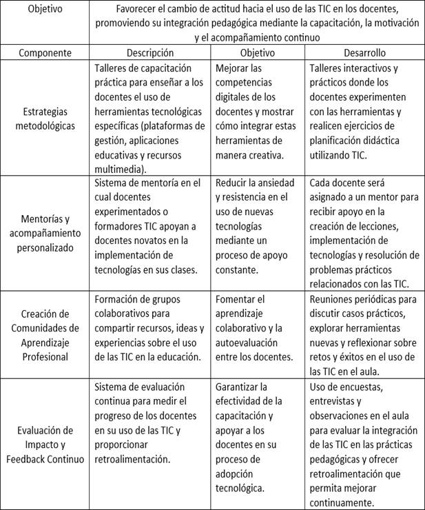 Sin embargo, para alcanzar estas metas, es necesario que exista una disposición para aprender y actualizarse constantemente en el uso de nuevas herramientas y metodologías digitales, además de participar en comunidades de aprendizaje docente para compartir experiencias y mejorar prácticas relacionadas con las TIC. El docente debe reconocer que estas competencias aseguran que no solo se utilicen las TIC de forma funcional, sino que también transformen sus prácticas pedagógicas, logrando un impacto significativo en el aprendizaje de los estudiantes. Es importante que los docentes, valoren que la formación continua es clave para que estas competencias evolucionen en sintonía con las demandas tecnológicas y educativas actuales.
