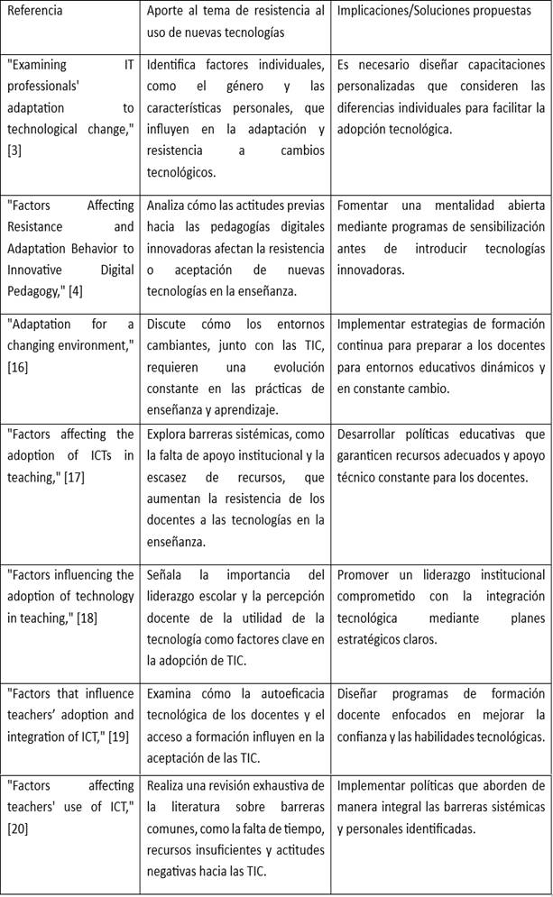 Los aportes destacan tanto factores internos (actitudes, autoeficacia) como externos (recursos, apoyo institucional) que contribuyen a la resistencia al uso de tecnologías. Los autores plantean soluciones que giran en torno a la formación docente, el apoyo institucional y la creación de entornos tecnológicos accesibles y motivadores.