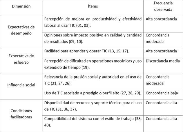 Para conocer el uso que le dan los docentes a las TICs se realizó el cuestionario que se describe en la tabla 3, las expectativas de desempeño reflejan una percepción positiva del impacto de las TIC en la productividad y calidad del trabajo, mientras que la expectativa de esfuerzo destaca la facilidad de aprendizaje y operación, aunque con cierta preocupación por el tiempo requerido para tareas mecánicas. La influencia social muestra un efecto moderado de las expectativas de colegas y autoridades en la adopción de TIC, con menor importancia del prestigio asociado a su uso. Finalmente, las condiciones facilitadoras revelan la disponibilidad de soporte técnico y recursos, además de una alta compatibilidad del sistema con el estilo y los métodos de trabajo. Este análisis subraya la necesidad de fortalecer el soporte organizacional y minimizar los puntos de fricción para maximizar el impacto positivo de las TIC en las actividades laborales.