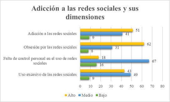 De la Tabla 4 se puede obtener como principales indicadores que el 50.5% de los encuestados considera que tiene un nivel alto de adicción a las RRSS, el 61.4% considera que hay un nivel alto de obsesión por las RRSS, el 66.3% considera que tiene un nivel medio de falta de control en el uso de las RRSS y el 48.5% indica que tiene un nivel medio de uso de RRSS.