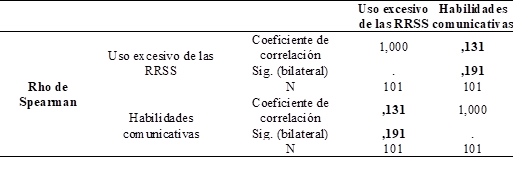De acuerdo con la Tabla 10, se determinó que según el valor del coeficiente de correlación de Spearman existe una correlación positiva mínima (rho= 0,131) entre la dimensión uso excesivo de las RRSS y la variable habilidades comunicativas. De la misma forma, ya que el valor de significancia observada (sig. = 0,191) es mayor a α = 0,05 se puede señalar que no existe una relación significativa entre las variables y, por consiguiente, se puede decir que existe una relación entre el uso excesivo de las RRSS y las habilidades comunicativas.