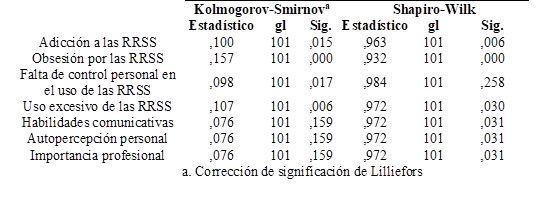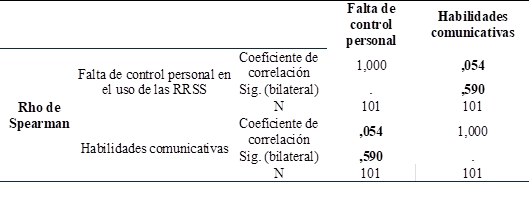 De igual modo, puesto que el valor de significancia observada (sig. = 0,590) es mayor a α = 0,05 se puede señalar que no existe una relación significativa entre las variables y, en consecuencia, se puede indicar que no existe una relación entre la falta de control personal en el uso de las RRSS y las habilidades comunicativas.