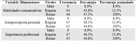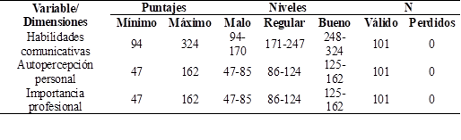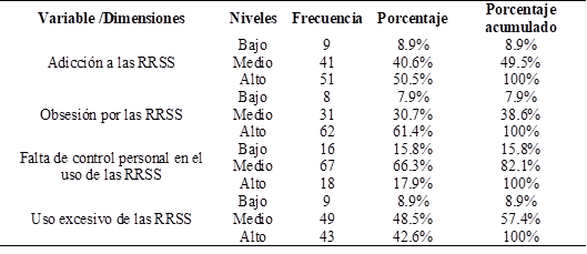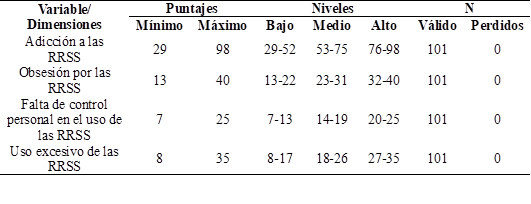 Para un análisis más comprensible de las variables, se realizó una adaptación de estas a fin de adaptarlas a una nueva escala, dividida en 3 niveles. Para la variable Adicción a las RRSS, se consideró los niveles: bajo, medio y alto; mientras que, para la variable Habilidades comunicativas, se consideró los niveles: malo, regular y bueno, como se puede apreciar en las Tablas 3 y 5 respectivamente.