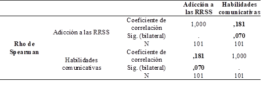 Respecto al objetivo general, se determinó que según el valor del coeficiente de correlación de Spearman existe una correlación positiva mínima (rho= 0,181) entre las variables adicción a las RRSS y las habilidades comunicativas. Asimismo, debido a que el valor de significancia observada (sig. = 0,070) es mayor a α = 0,05 se puede señalar que no existe una relación significativa entre las variables y, por ende, se acepta la hipótesis nula y se rechaza la hipótesis alternativa. En ese sentido, se puede decir que no existe una relación entre la adicción a las RRSS y las habilidades comunicativas.