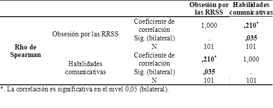 Como se aprecia en la Tabla 8, se determinó que según el valor del coeficiente de correlación de Spearman existe una correlación positiva baja (rho= 0,210) entre la dimensión obsesión por las RRSS y las habilidades comunicativas. Además, ya que el valor de significancia observada (sig. = 0,035) es menor a α = 0,05 se puede señalar que existe una relación significativa entre las variables y, por ende, se puede decir que existe una relación entre la obsesión por las RRSS y las habilidades comunicativas.