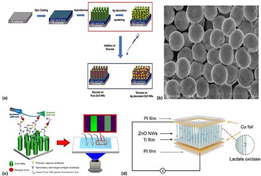ZnO has been positioned as a leading material in next generation biosensors due to its compatibility with chemical stability, biocompatibility and scalable fabrication tech- niques (e.g., screen printing, hydrothermal growth). These ZnO-based nanobiosensors are more frequently tailored for wearables and point-of-care deployment. A thorough review by Zhou et al described ZnO-based enzyme biosensors and substantiated the ma- terial’s broad relevance to clinical diagnostics.