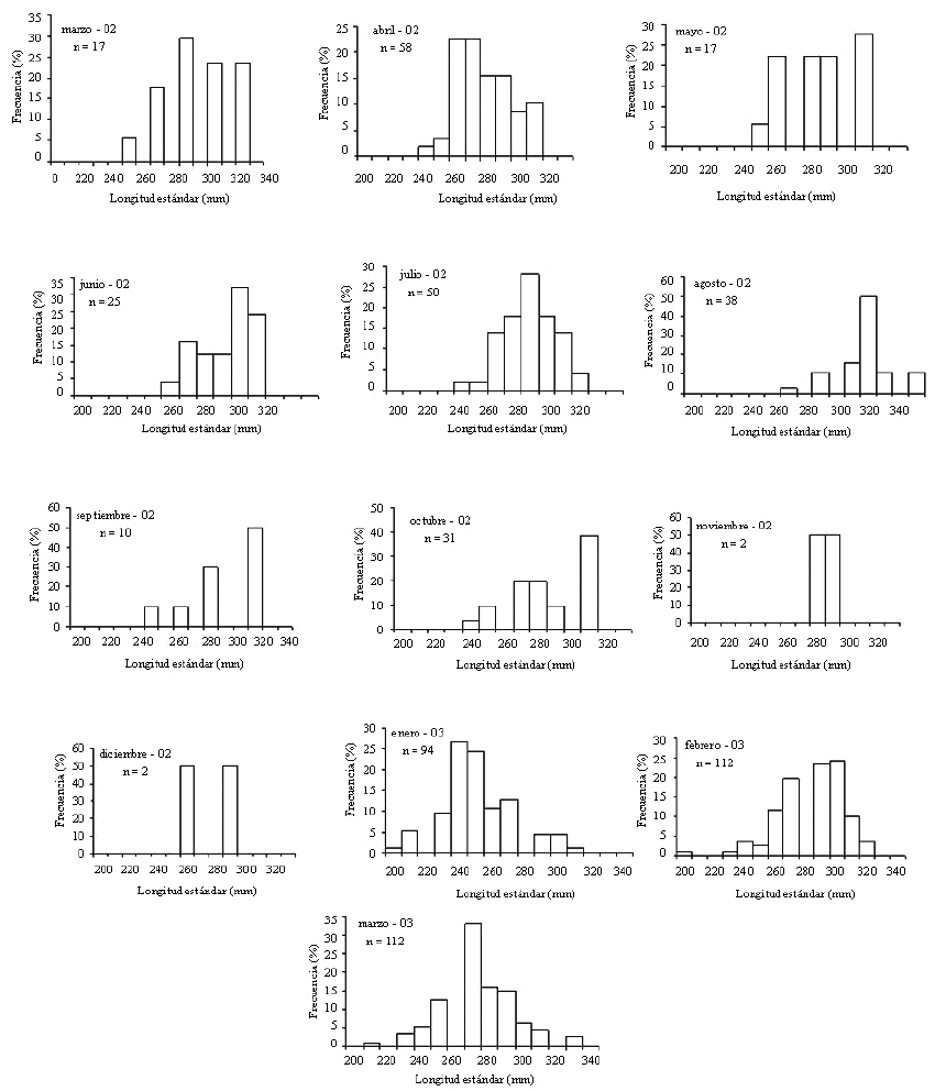 Figura 2. Estructura mensual por tallas de H. brasiliensis de la Isla de Cubagua. (marzo 2002 a marzo 2003)