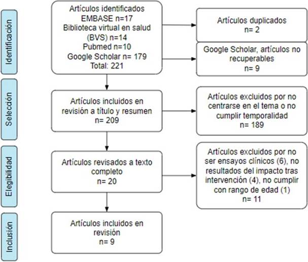 Se realizó una primera revisión manual de los 209 artículos distribuidos, teniendo como criterios la coherencia del título y el resumen con lo propuesto para esta revisión. Posteriormente se excluyeron 189 artículos, quedando una selección de 20 artículos. En una segunda revisión dos autores cribaron 7 artículos cada uno de forma manual y uno cribó 6, verificando que los artículos cumplan con los criterios de inclusión y exclusión. Para la traducción de artículos al idioma español se utilizó la herramienta DeepL Translate. Finalmente, se excluyeron 11 artículos por no cumplir con uno a más criterios de inclusión o exclusión, y fueron 9 los artículos restantes incluidos en la revisión (Figura 1).