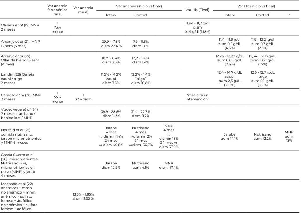 *Los resultados se reportaron como incremento o disminución de la anemia o hemoglobina, en porcentajes. * aum = aumento del valor en x% /dism = disminución del valor en x% * Var anemia ferropénica (final): indica la diferencia de valores finales entre los grupos de intervención I y control C. (ejm: I 73% menor: el grupo de intervención presentó 73% menos de anemia que el control al final del estudio) * Var anemia (inicio vs final): indica el cambio estado de anemia o hemoglobina en un grupo específico, desde el comienzo de la intervención hasta el final de la intervención. * Tanto Neufeld como García presentan 3 grupos de estudios (2 intervenciones y 1 control) por lo que añade una tercera columna para el grupo de intervención faltante.