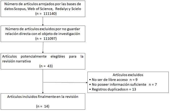 En el proceso de selección de artículos, se encontraron 111140 artículos científicos dentro del periodo 2018 - 2022. Se excluyeron 111097 estudios a razón de no coincidir con el tema de la investigación. Quedando, un total de 14 artículos a examinar luego de la lectura de los registros seleccionados como potencialmente elegibles (ver Figura 1).