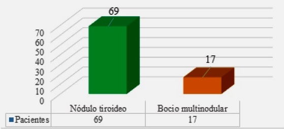De los 122 pacientes de la totalidad de la muestra, se excluyeron 36 pacientes que no se resolvieron en el Centro Médico Docente La Trinidad, quedando un total de 86 pacientes, y que según se muestra en la Figura 1 registraron un promedio de edad de 48 años, de estos pacientes el 80,2% fueron femeninas, con un porcentaje de 64% entre 40 y 59 años de edad. Los pacientes masculinos representaron un 17% siendo un 9,3% de entre 40 y 59 años. Al examen el diagnóstico clínico fue de 80,2% con nódulo tiroideo y 19,7% con bocio multinodular (Figura 2).