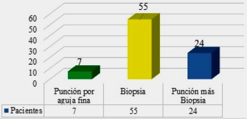 En la Figura 3 se aprecia que el procedimiento para el estudio anatomopatológico más aplicado fue la biopsia en el 64% de la muestra, seguido de un 27,9% con punción por aguja fina más biopsia, y un 8,1% solo con punción por aguja fina.