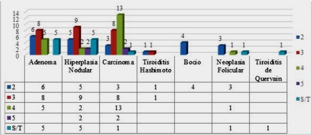 Con respecto a los datos imagenológicos de los pacientes, la Figura 4 muestra que un 30,2% corresponde a la escala TI-RADS 3, siendo la clasificación TI-RADS 5, la menos frecuente. Es importante resaltar que de los 86 pacientes que conformaron la muestra, en solo 13 no se clasificó ecográficamente según la clasificación de TI-RADS. Sin embargo, en estos 13 pacientes se les diagnosticó finalmente adenoma e hiperplasia a 5 pacientes respectivamente, 1 con carcinoma, 1 con neoplasia folicular y 1 con Tiroiditis de Quervain (Figura 5).