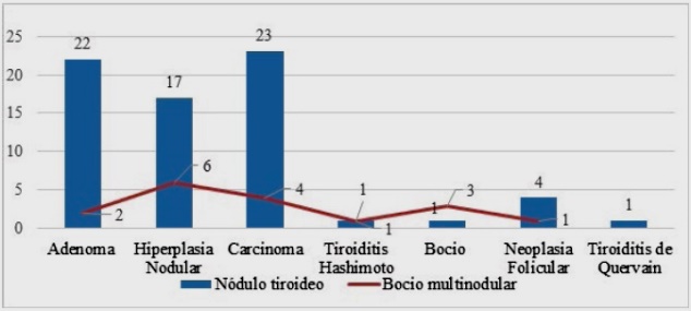 Según el diagnóstico clínico, de los 69 pacientes con nódulo tiroideo, 23 presentaron carcinoma, 22 presentaron adenoma, 17 hiperplasia nodular. Por otra parte, los pacientes con Bocio presentaron más hiperplasia nodular dentro de los 17 que corresponde este grupo (Figura 6).