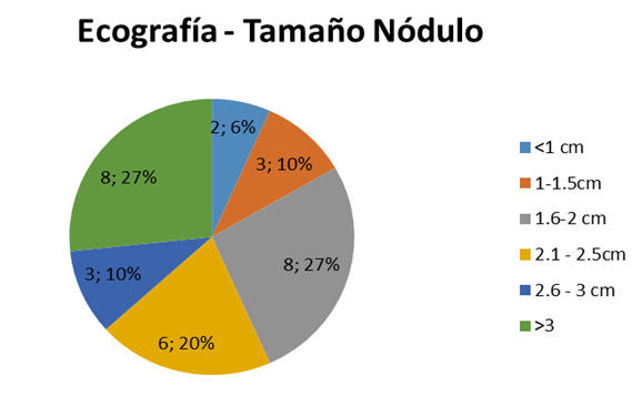 En el estudio realizado por Kamran et al, se concluyó que el cáncer tiroideo parece ser más común en aquellos nódulos ≥ 2 cm en comparación con aquellos < 2 cm. Además, la precisión de la PAAF es menor en aquellos con nódulos > 3 cm. (14) En nuestro estudio se pudo constatar la misma teoría, ya que la presencia de cáncer se encontró en los nódulos con un tamaño por encima de los 2,5 cm. (Gráfico 1).