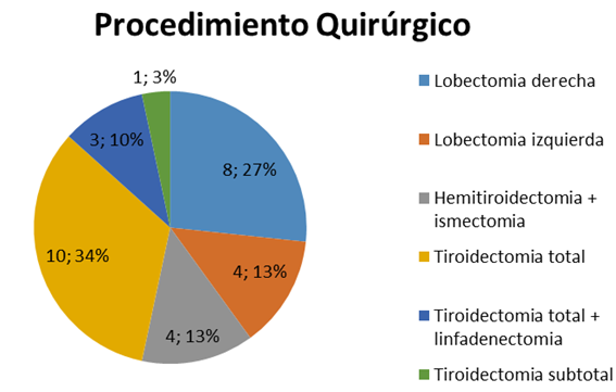 Con relación al procedimiento quirúrgico, se realizó en un 34% tiroidectomía total, un 13% hemitiroidectomía + ismectomía, un 27% fue lobectomía derecha, el 13% lobectomía izquierda, 10% tiroidectomía total + linfadenectomía central y tiroidectomía subtotal en un 3%. (Gráfico 2)