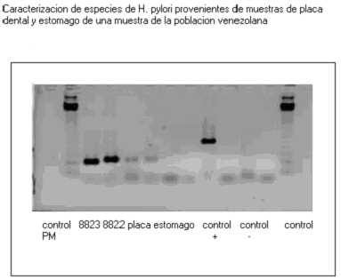 Como parte del trabajo de nuestro grupo, es importante señalar que como estos pacientes presentaban indicación de endoscopia y uno de nuestros objetivos era el de correlacionar los genotipos presentes en la cavidad bucal con los del estómago, a cada uno de los pacientes le fueron tomadas dos biopsias del antrum, una para análisis histopatológico y otra para RCP. De esta forma incluimos en el gel presentado en este reporte, además de la muestra de placa dental, la biopsia de estómago del mismo paciente, la que nos dió resultados similares a la de placa dental, es decir las dos corrieron como la especie 8822 que es s2/m2, la cual se caracteriza por no producir toxinas activas.16