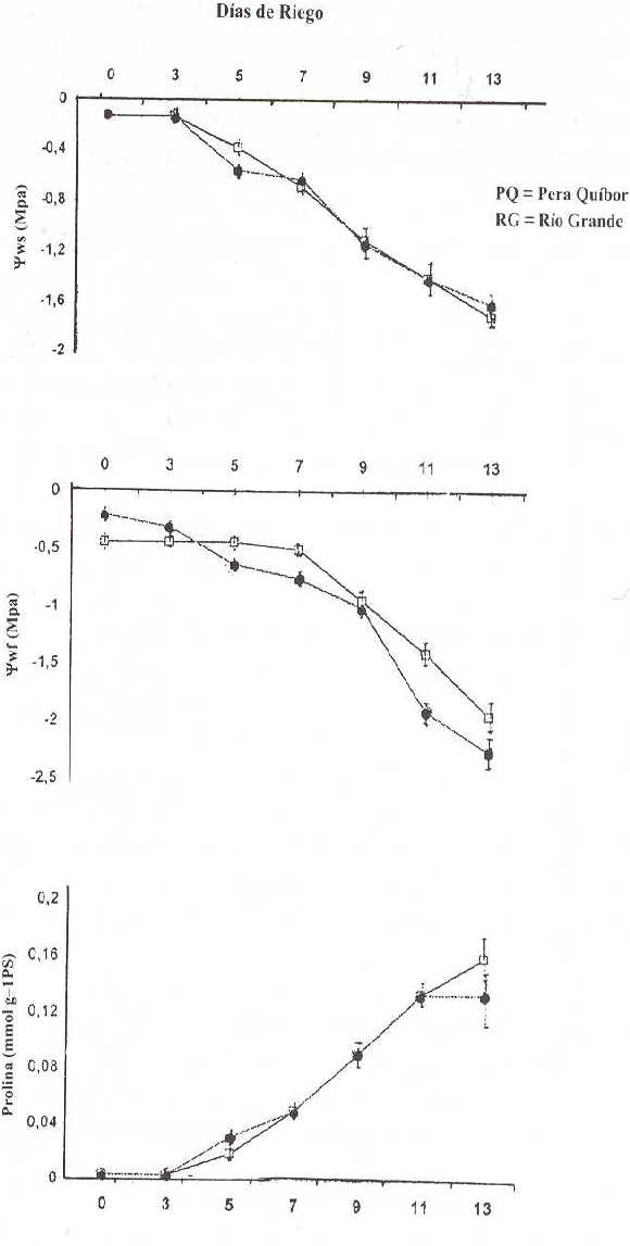 La Figura 1 muestra los valores promedios del Yws, Ywf y del contenido de prolina en las plantas sometidas a DH. Se observa disminución progresiva en los valores de Yws y Ywf y un aumento en el contenido de prolina, a medida que avanza el período de tratamiento en ambas variedades. En PQ el Ywf se mantiene en los primeros 7 d del período de tratamiento, mientras que en RG comienza a disminuir desde el 3er d; la disminución del Ywf es menor en PQ comparada con la de RG, esta diferencia se mantiene a lo largo del período de DH. El contenido de prolina muestra una tendencia semejante con un valor ligeramente mayor para PQ al final del período.