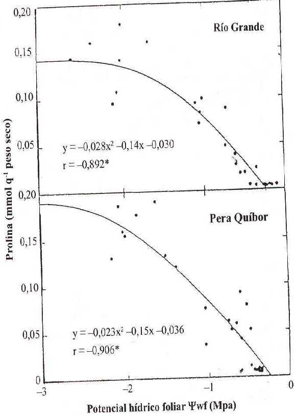 Los coeficientes de correlación de Pearson se presentan significativamente diferentes de 0 (a = 0,05) para ambas variedades, siendo mayor para PQ. La semejanza entre ambas curvas sugiere que el patrón de acumulación de prolina es el mismo en los dos cultivares. Hanson et al., (1979) encontraron resultados similares en varios tipos de cebada e indicaron que el proceso que ocasiona la acumulación de prolina debe responder de igual forma ante el DH en cada tipo. Los resultados se diferencian de los señalados por otros autores (McMichael y Elmore, 1977; Fukutoku y Yamada, 1981a; Levi, 1983) donde la acumulación de este metabolito comienza antes de que se alcancen niveles severos de DH. Aunque en pequeña proporción, el incremento de prolina en los tejidos foliares de plantas sometidas a deficiencia de agua, puede ser atribuido a la hidrólisis de proteínas presentes a medida que se desarrolla el DH (Stewart, 1972; Stewart y Hanson, 1980).