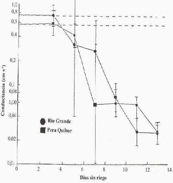 En la Figura 3 se presentan los valores de la gs durante el período de DH para los dos variedades; observando que su disminución comienza al 3er d en ambas variedades; las tendencias son semejantes y las desviaciones estándares se superponen particularmente al 5to d para RG (Ywf -0,63 MPa) y 7mo d para PQ (Ywf -0,50 MPa) en los cuales se presenta una muy elevada desviación estándar.