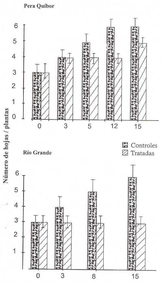 A lo largo del tratamiento se observa que en el 3er d, RG ya presenta un porcentaje de disminución en el NH (-25%), mientras que en PQ es al 5to d (-20%); en RG en el 8vo d se obtuvo -40% y en el 15to d 50%, en la PQ en el 12do y 15to d se presentaron -33% y -17%, respectivamente, lo que muestra que en PQ hubo reducción en el porcentaje de disminución en la producción de hojas con respecto a las plantas control.