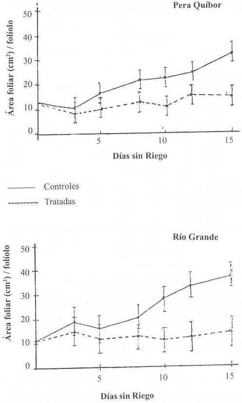 FIGURA 5. Valores promedios de área foliar de folíolos de plantas controles y tratadas de ambas variedades durante el período sin riego. Cada valor representa el promedio de la medición en cuatro réplicas ± de.
