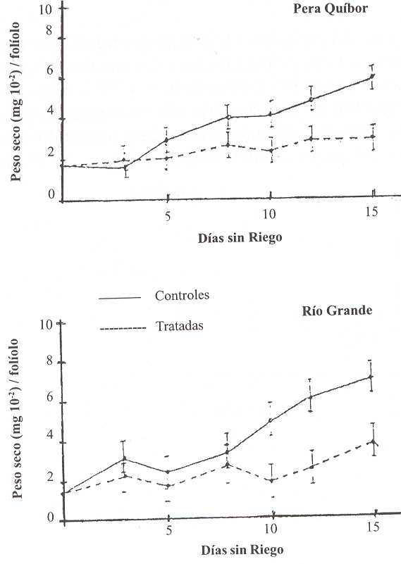 FIGURA 6. Valores promedios de peso seco de folíolos de plantas controles y tratadas de ambas variedades durante el período sin riego. Cada valor representa el promedio de la medición en cuatro réplicas ± de.
