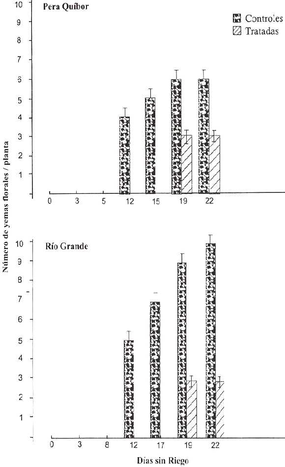 Para los días 19 y 22 del período de DH el porcentaje de disminución en las plantas tratadas con respecto a las controles fue de 50% para ambos días en PQ, mientras que en RG fueron de 67% y 70%, respectivamente. Se sabe que la floración es muy sensible a la escasez de asimilados que puede producirse bajo condiciones limitantes, pudiendo conducir al retraso o absorción de yemas florales (Russell y Morris, 1983; Ho, 1984).