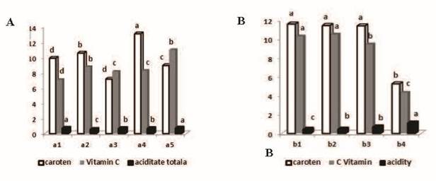 In the interaction of factors, the fertilizing product assortment and the period of storage, at Antalya cultivar, it appears that the best variants were a4b1, a4b2, a4b3 for carotene content and a5b1, a5b2 and a5b3 for vitamin C content (Table 1)