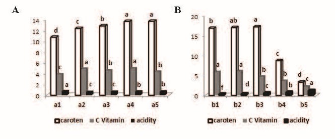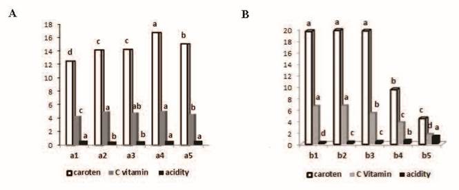 During storage, in the study, the storage time significantly affects the chemical composition of the fruit at Antalya cultivar. The highest level of content in carotene, vitamin C and acidity was recorded by the variants b1-without storage, b2-storage for seven days, b3-storage for 21 days. For the b4 version, the values decreased for carotene and vitamin C while acidity increased. In the b5 version, storage for 42 days, the fruits degraded (Figure 1B) and did not have the nutritional value.