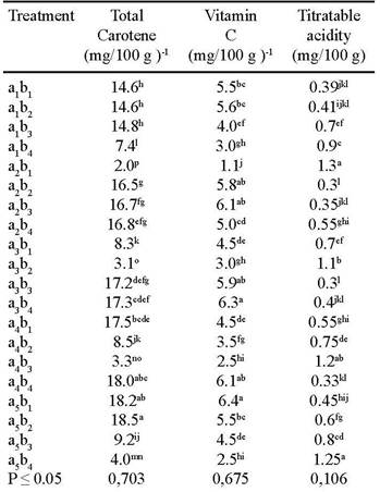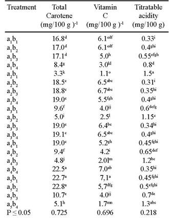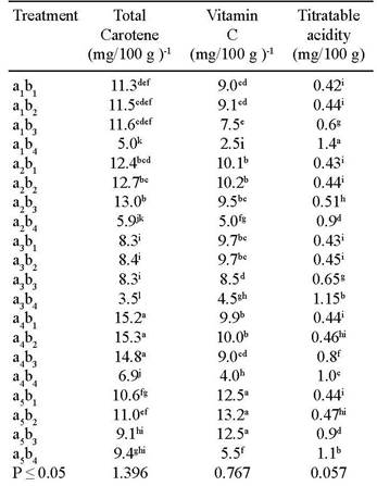 Regarding the interaction between foliar fertilizer products and the storage period of fruits, the best carotene accumulation was recorded at a4b1; a4b2 and a4b3 variants and vitamin C was recorded at a4b2 variants, and for titratable acidity a1b5 (Table 2).