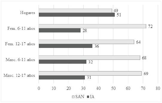 La proporción de IA en los niños y adolescentes en los grupos de edades 6-11 años y 12-17 años duplica la SAN, con proporciones que van entre 64 a 72 %. Esto significa que 6 o 7 niños de cada 10 niños se preocupan y tienen insuficiente acceso a los alimentos en términos de cantidad, calidad. En el grupo de las niñas entre 6 a 11 años la IA es 2,5 veces mayor. La SAN plena se ubicó entre 28 y 36 % en todos los grupos de edad y sexo estudiados (Figura 1).