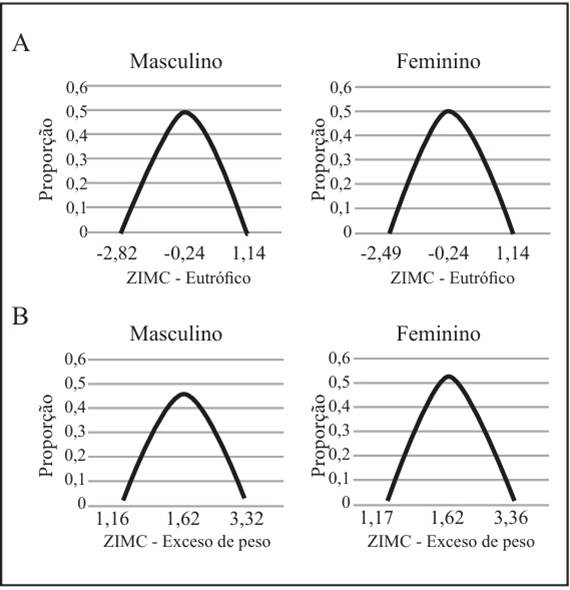 Figura 1 Distribuição do escore Z de índice de massa corporal em mediana, (A) em adolescentes eutróficos (Md= 1,-0,24) e (B) em adolescentes com excesso de peso (Md= 1,64)